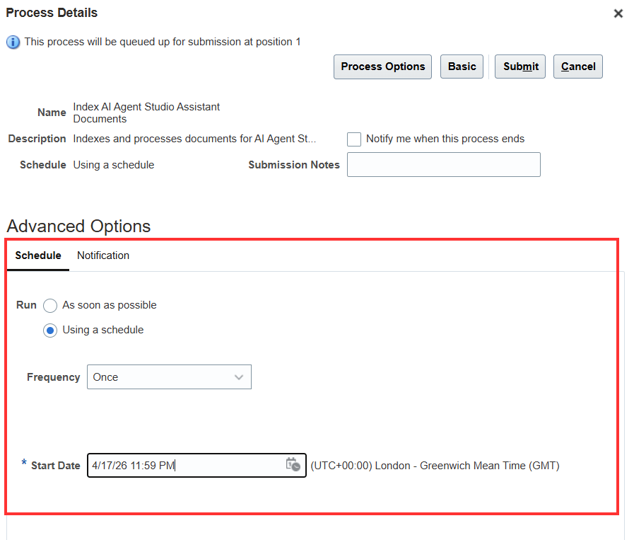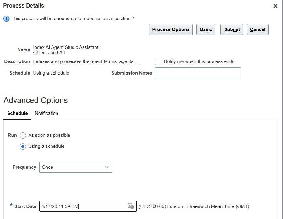 Now schedule the second ESS job to use the integrated AI help agent. The job is called Index AI Agent Studio Assistant Objects and Attributes.