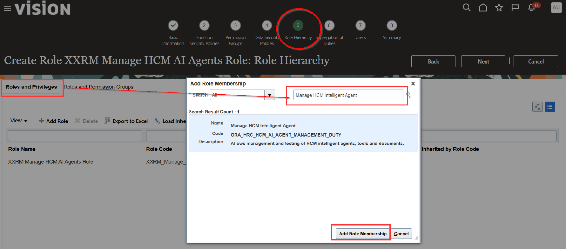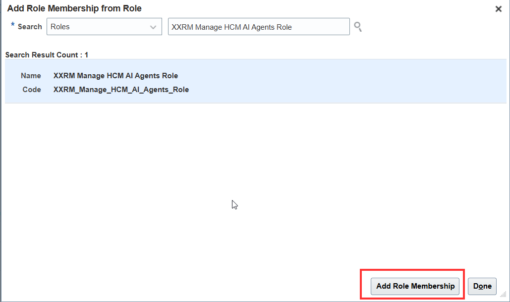 Search for the custom role you created. In my case, it is called XXRM Manage HCM AI Agents Role. Click Add Role Membership.