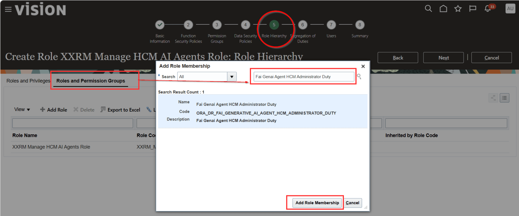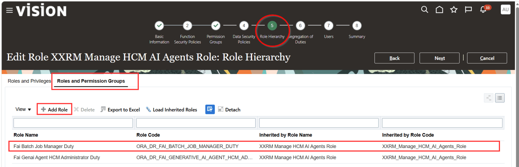 To add the role, navigate back to the Role Hierarchy tab. Under Roles and Permission Groups, click Add Role. Search for the role Fai Batch Job Manager Duty and click Add Role membership.