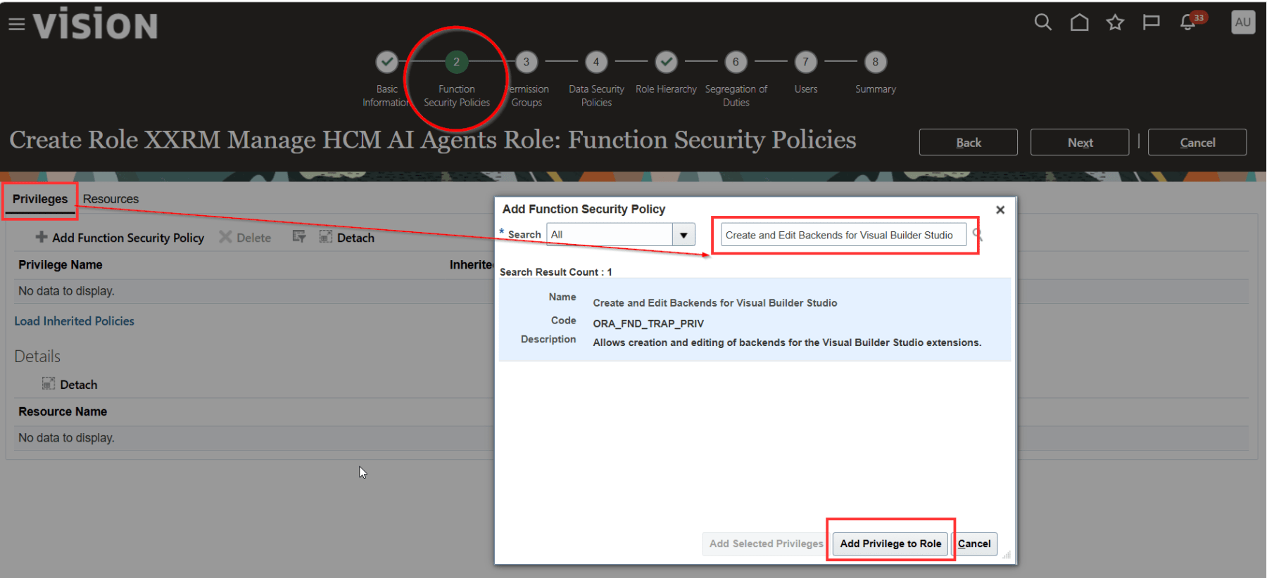 (Optional) If you want users to create External REST API tools in AI Agent Studio, the Create and Edit Backends for Visual Builder Studio (ORA_FND_TRAP_PRIV) privilege must be added to the custom role.