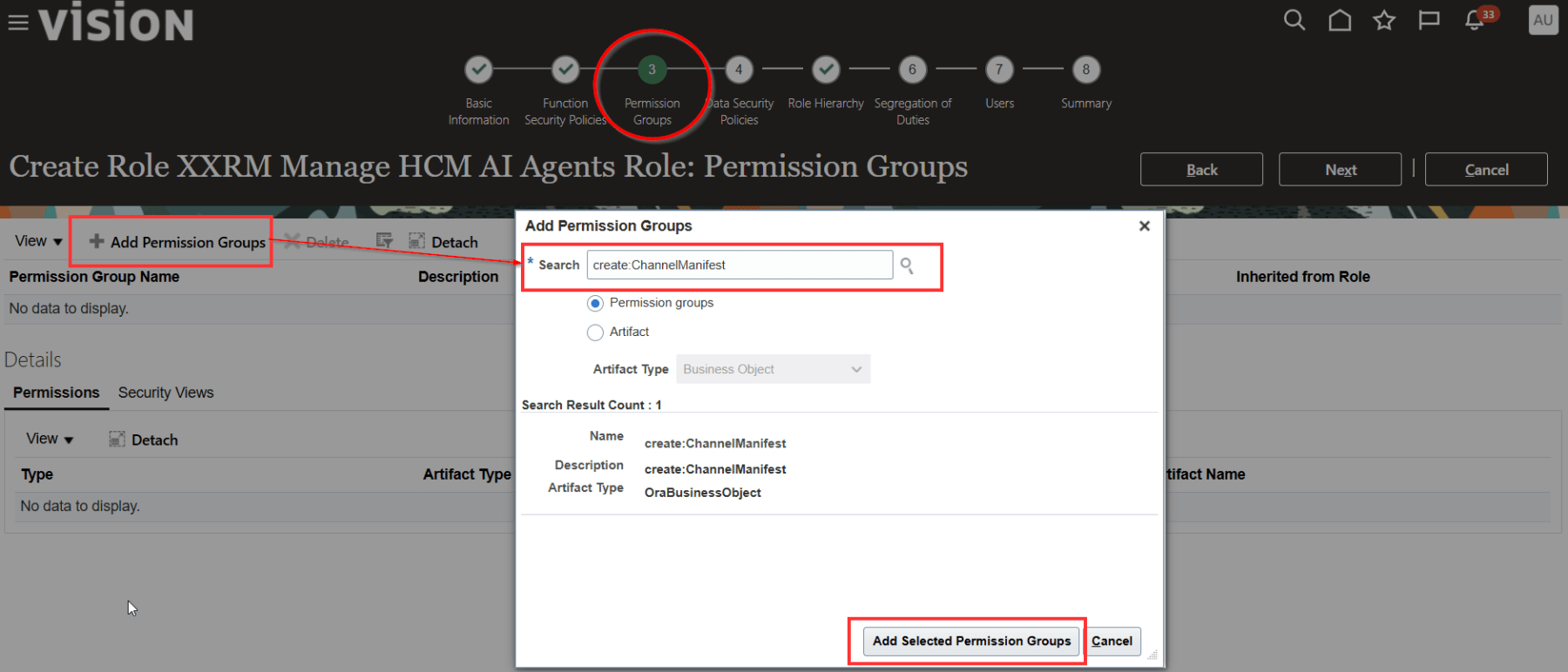 To add the permission groups, navigate to the Permission Groups section. Click Add Permission Groups. Search for each of the permission groups mentioned below and click Add Selected Permission Groups: