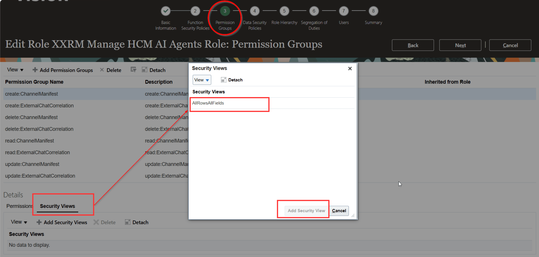 Once completed, you need to add security view for each permission groups we added in the above step. To do that, select each of the permission groups one by one and navigate to the Security Views tab for each permission group. Add the AllRowsAllFields security view and click Add Security Views.