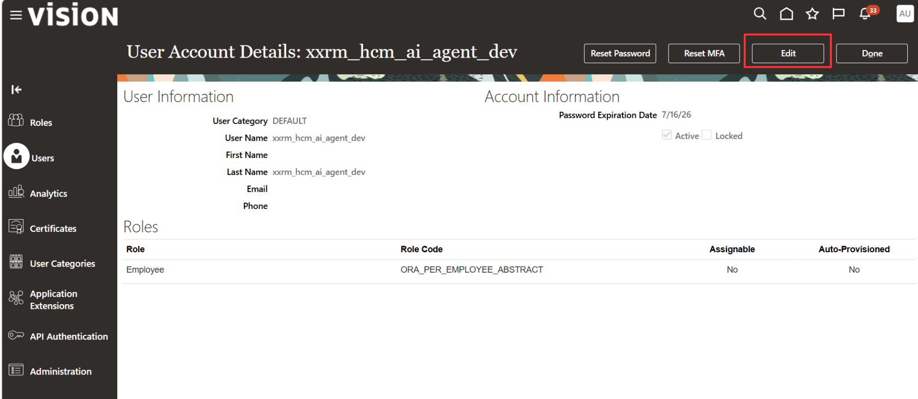 This user currently has only the Employee abstract role assigned. To assign our new custom role to this user, click Edit.