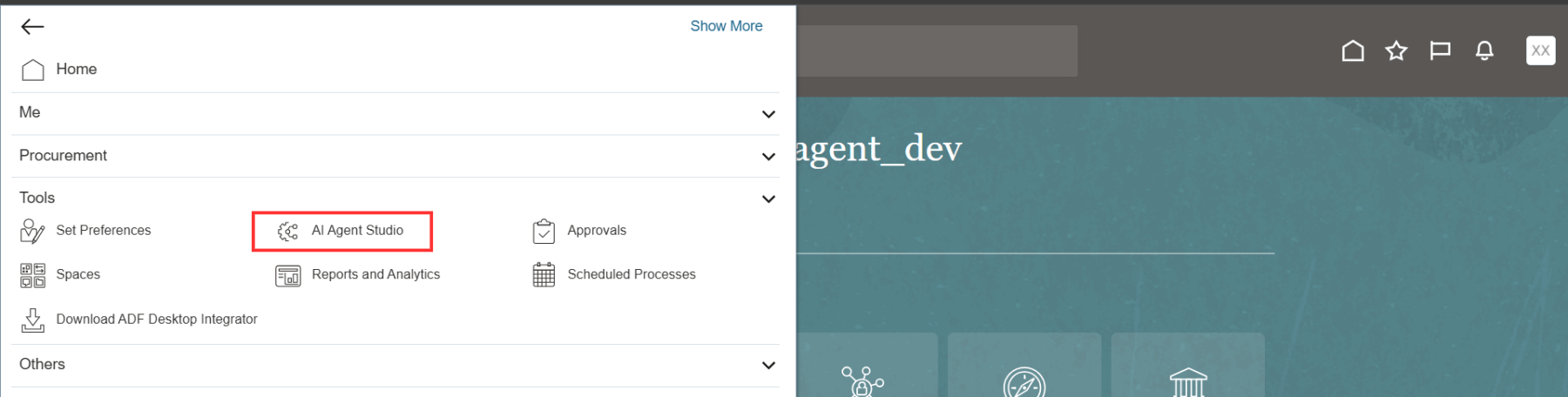 Navigate to Tools from the navigator, and the menu AI Agent Studio should appear. Click on AI Agent Studio.